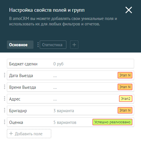 - Добавление полей в карточки сделок, контактов и компаний;