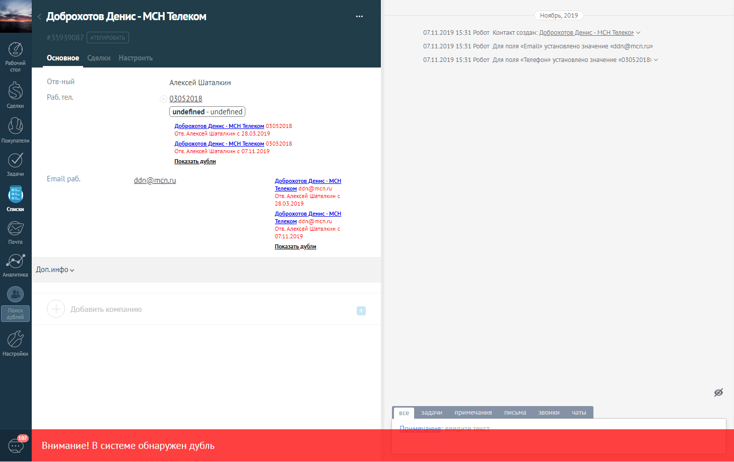 При создании новых контактов и компаний виджет предупредит Вас о наличии уже ранее созданных подобных контактов, так же покажет за каким менеджером он закреплен.
