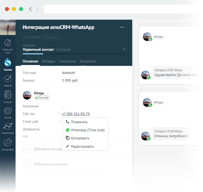 Старая цена интеграции WhatsApp (Time Chat) и amoCRM составляла 2 500 руб/мес, сейчас же стоимость виджета составляет 900 руб/мес.